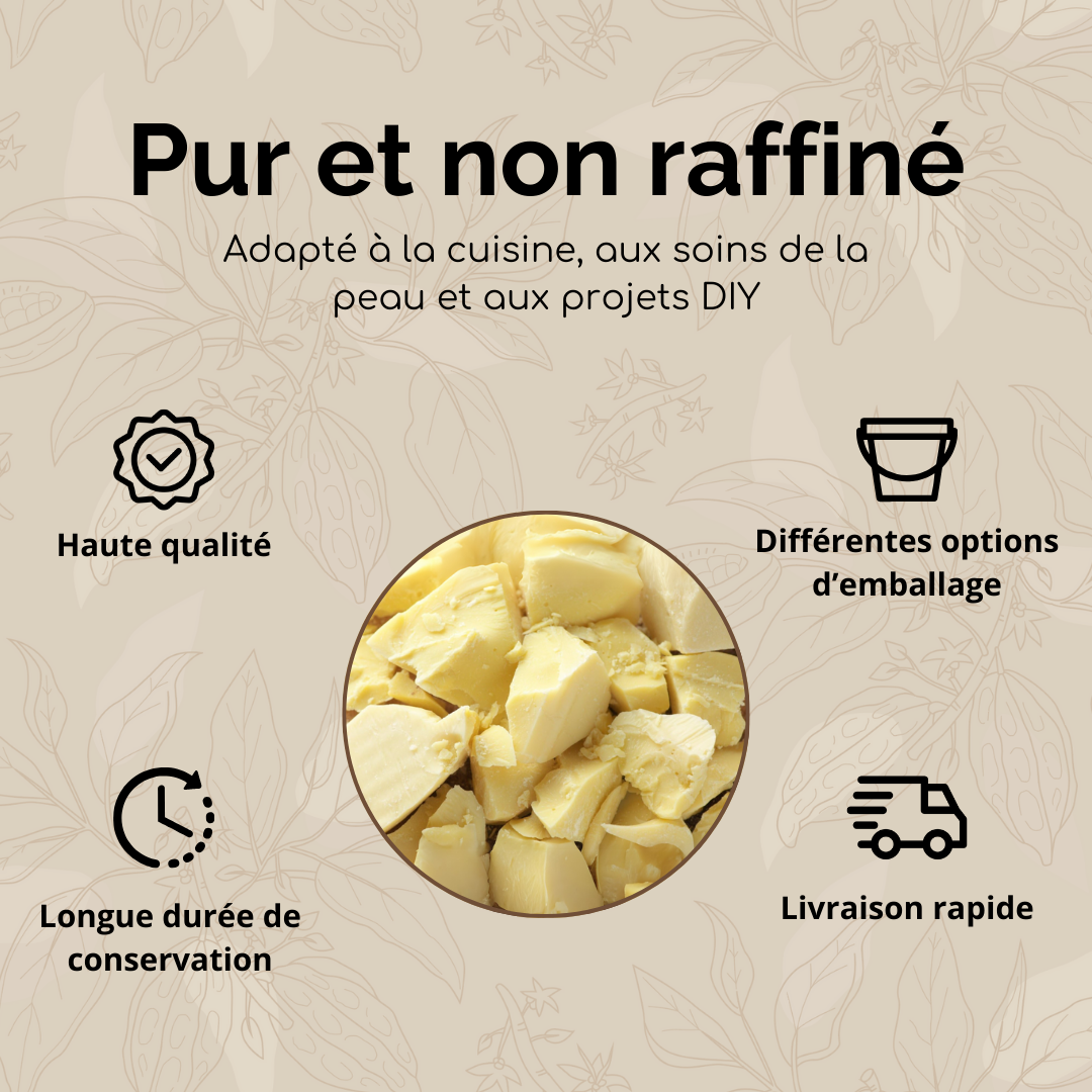 Oui, notre beurre de cacao est non raffiné et pressé à froid. Cela signifie que le beurre est pressé à basse température, ce qui permet de conserver tous les nutriments naturels, les antioxydants et l'arôme caractéristique du cacao. Vous êtes ainsi assuré d'une qualité pure, adaptée à la cuisine, à la pâtisserie et aux applications cosmétiques.